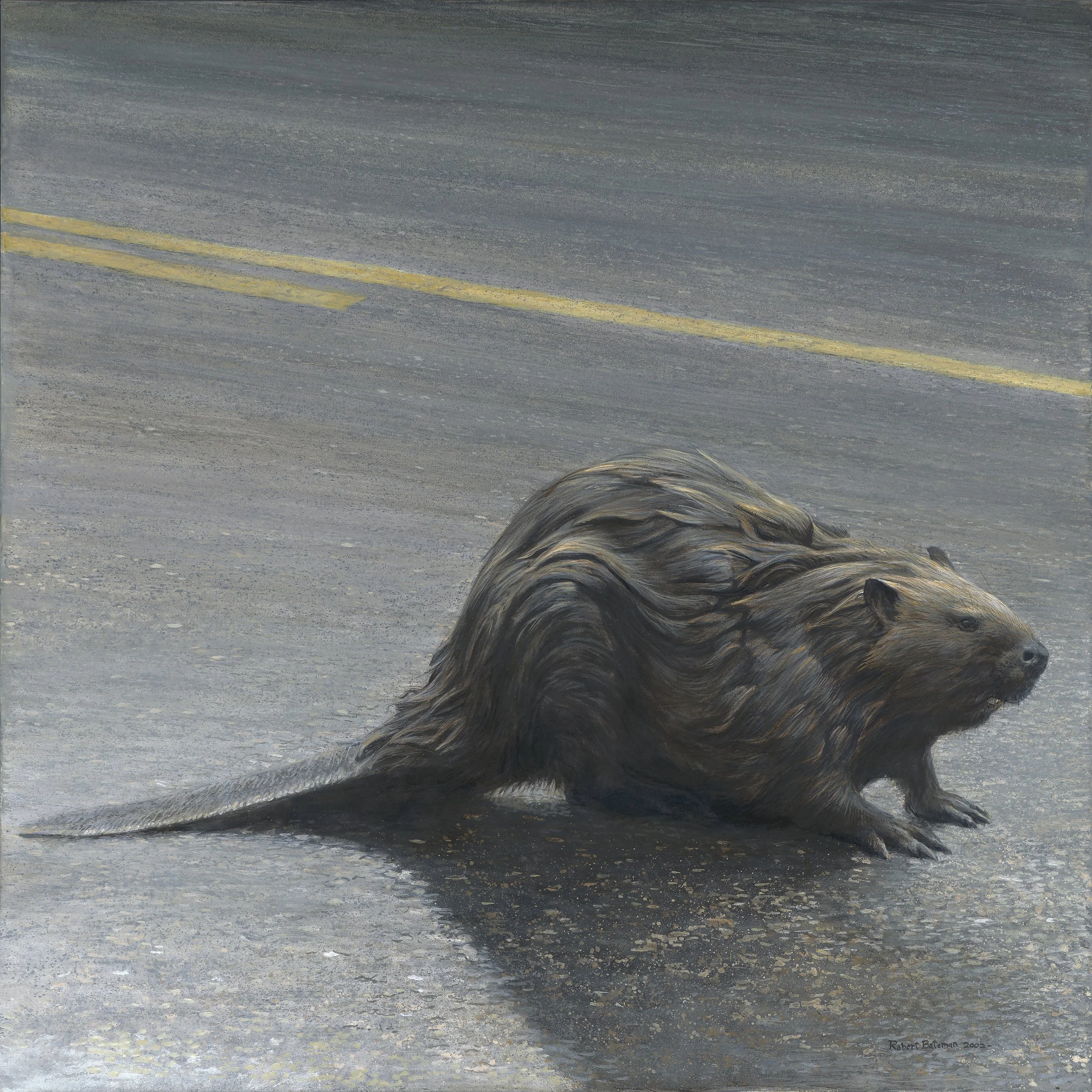 Without the yellow line speeding through the painting, it would be nothing as edgy. The beaver has just emerged from his pond and the thick fur so sought after by early trappers is plastered to his body. He looks like a handsome bronze sculpture. But also, perilously like potential road kills