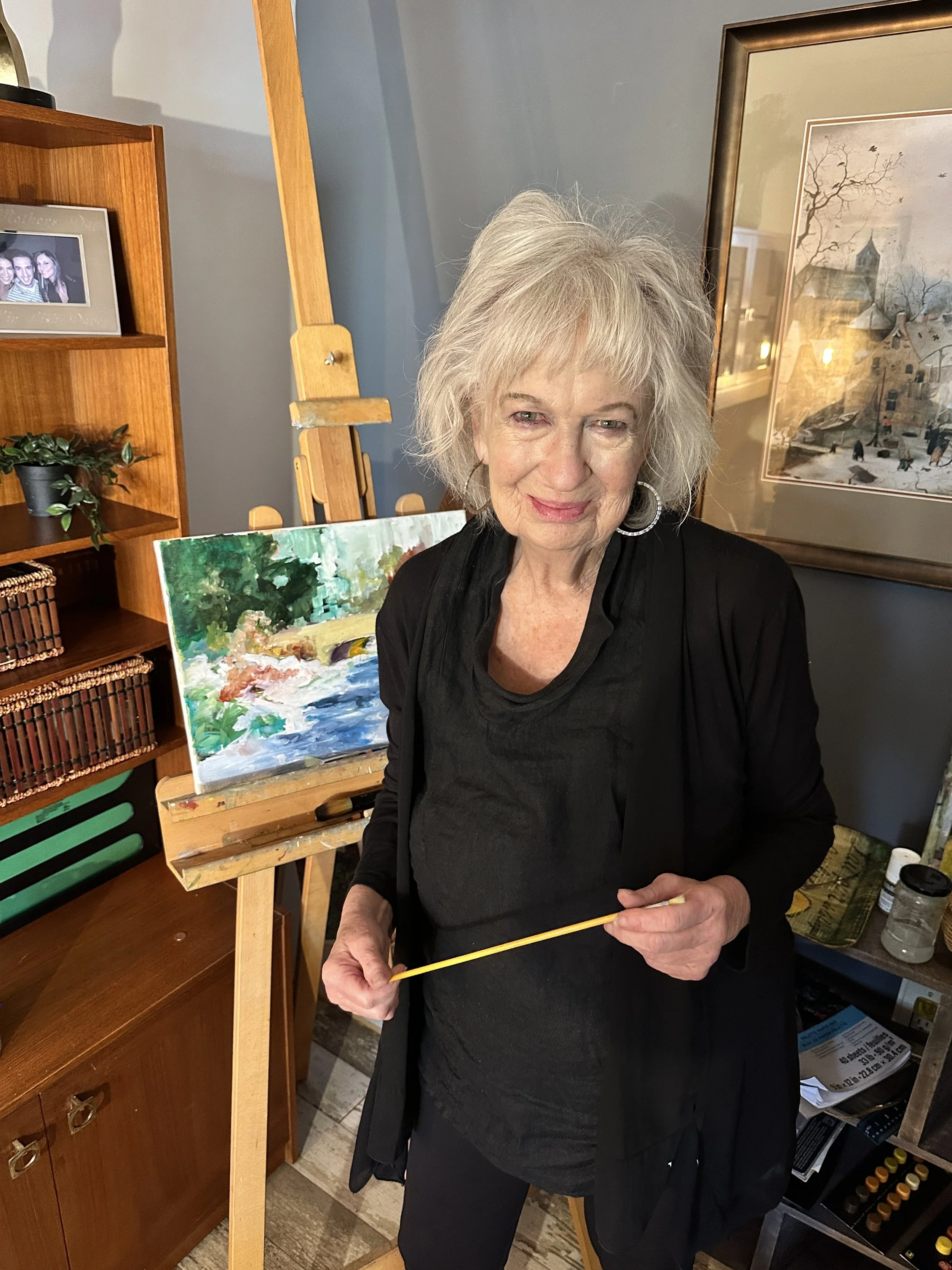 She also enjoys a road trip into the local countryside and will often stop along the way when she's inspired by the landscape she's passing by. She'll make studies in her sketch book and take photographs for reference material and work them up into oil paintings in her studio.